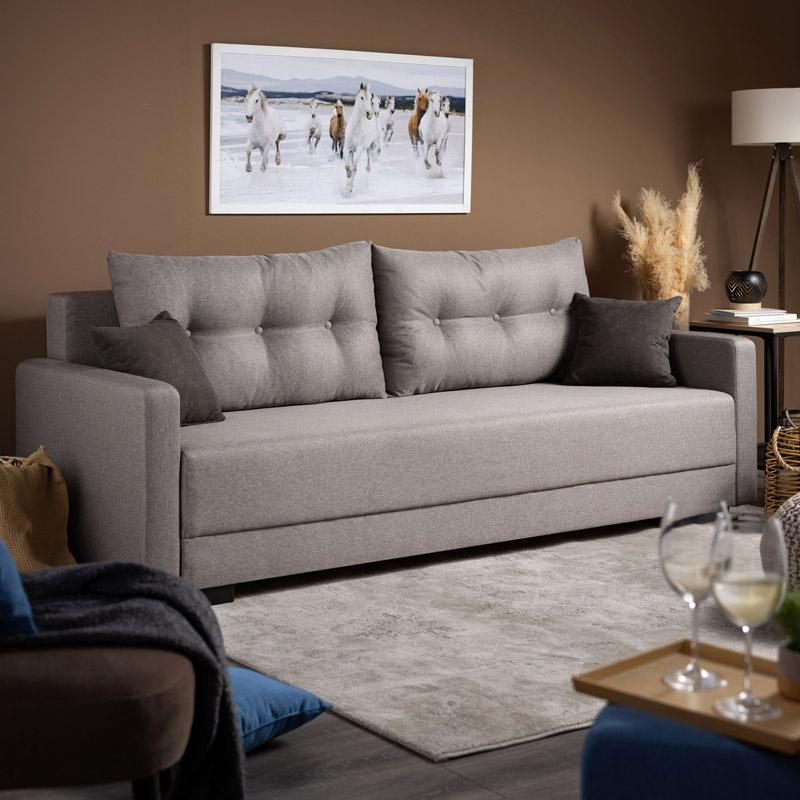 Ο καναπές προσφέρει πρακτική λειτουργικότητα και άνεση, καθώς μετατρέπεται εύκολα σε κρεβάτι με απλή αναδίπλωση της πλάτης και συρόμενο κάθισμα. Η διαδικασία επέκτασης είναι γρήγορη και ξεκούραστη, προσφέροντας επιφάνεια ύπνου διαστάσεων 150x198cm, ιδανική για καθημερινή ή περιστασιακή χρήση. Διαθέτει αφρολέξ υψηλής ποιότητας που εξασφαλίζει εργονομική στήριξη και άνετη ξεκούραση, τόσο στο κάθισμα όσο και στον ύπνο. Επιπλέον, ο ενσωματωμένος αποθηκευτικός χώρος προσφέρει πρακτική λύση για την οργάνωση κουβερτών, μαξιλαριών ή άλλων αντικειμένων, καθιστώντας τον καναπέ ιδανική επιλογή για κάθε σύγχρονο σπίτι.