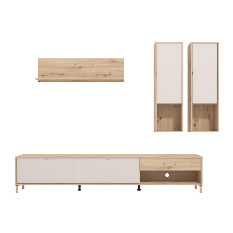 Η σύνθεση τηλεόρασης Norwich συνδυάζει μοντέρνα αισθητική και πρακτικότητα, ιδανική για κάθε σύγχρονο χώρο. Διαθέτει δύο κρεμαστά ράφια τοίχου, με ανοιχτό και κλειστό τμήμα , επιτρέποντας τόσο την εκθεσιακή τοποθέτηση διακοσμητικών αντικειμένων όσο και την αποθήκευση με προστασία. Ο χώρος αποθήκευσης περιλαμβάνει δύο πορτάκια για να φυλάξετε τα αντικείμενά σας με τάξη, καθώς και ένα συρτάρι για επιπλέον αποθήκευση μικροαντικειμένων.Η σύνθεση αυτή ενισχύεται από τις μεταλλικές χειρολαβές, οι οποίες προσδίδουν μια μοντέρνα και στιβαρή αίσθηση στην εμφάνιση του επίπλου, ενώ παράλληλα εξασφαλίζουν άνετη και εύκολη χρήση. Το συνολικό σχέδιο δημιουργεί μια ισχυρή και κομψή παρουσία στον χώρο, ενώ παράλληλα προσφέρει την απαιτούμενη λειτουργικότητα και αποθήκευση για τις καθημερινές ανάγκες.