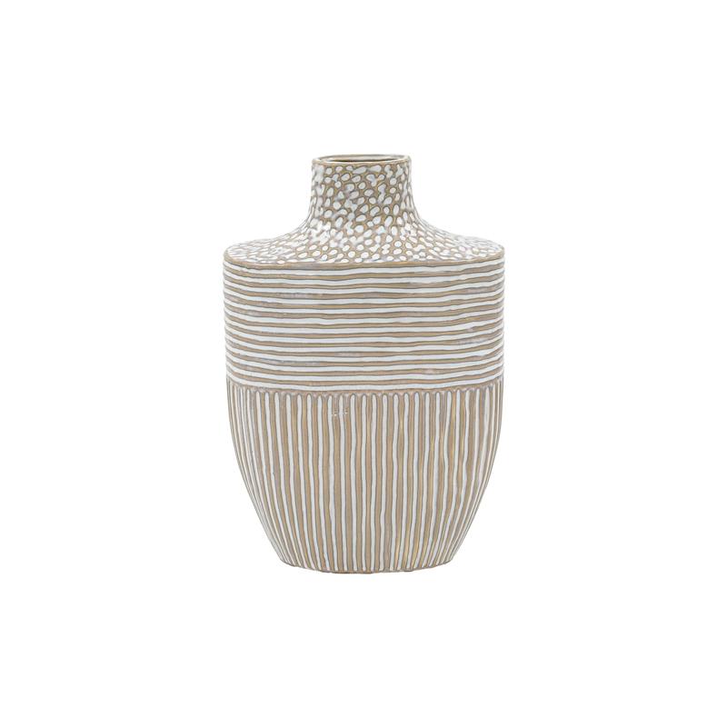 Προσθέστε μια πινελιά κομψότητας στον χώρο σας με αυτό το εντυπωσιακό διακοσμητικό βάζο. Χειροποίητο από κεραμικό και διακοσμημένο με μοναδικές λεπτομέρειες, αποτελεί την ιδανική επιλογή για εκλεπτυσμένους και μοντέρνους εσωτερικούς χώρους. Τοποθετήστε το στο τραπέζι, το ράφι ή την κονσόλα σας και δώστε έναν ιδιαίτερο χαρακτήρα στη διακόσμηση του σπιτιού σας.