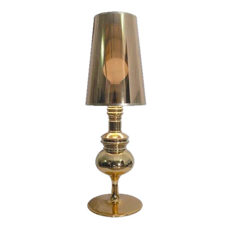 Αυτή η επιτραπέζια λάμπα έχει ένα εντυπωσιακό και κομψό σχέδιο με vintage και πολυτελή αισθητική. Η βάση της είναι κατασκευασμένη από γυαλιστερό, χρυσό μεταλλικό υλικό, με έντονα διακοσμητικά στοιχεία και καμπύλες, προσδίδοντας έναν αέρα κλασικής κομψότητας. Το καπέλο της λάμπας είναι επίσης σε χρυσό τόνο, με γυαλιστερή, ημιδιαφανή υφή που αφήνει να διακρίνεται ελαφρώς ο λαμπτήρας στο εσωτερικό, προσθέτοντας ένα μοντέρνο και εκλεπτυσμένο στοιχείο.