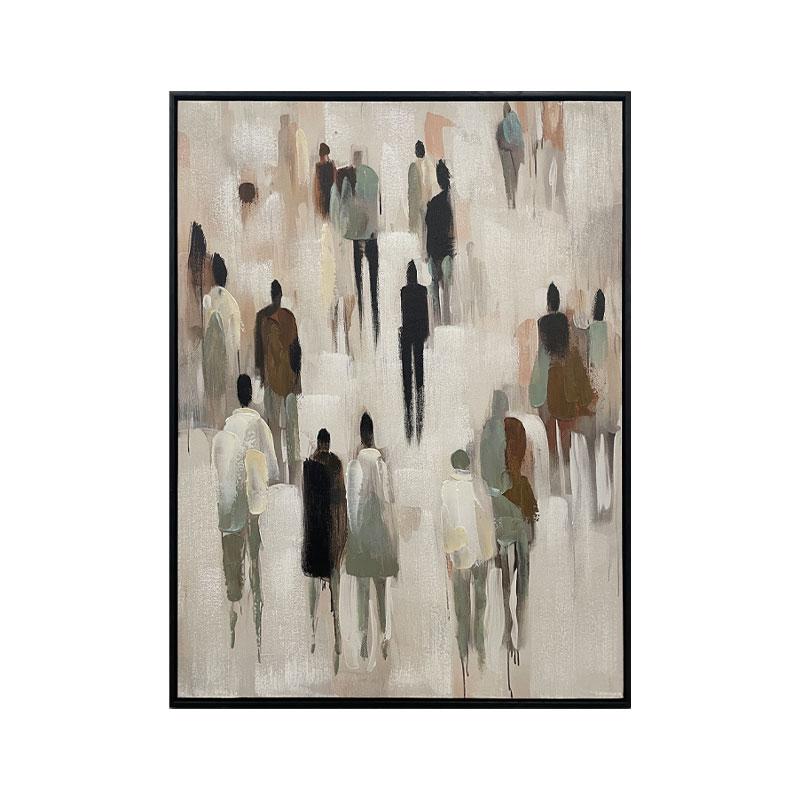Φαντάσου ένα έργο τέχνης σε καμβά, αποτυπωμένο με την τεχνοτροπία της ελαιογραφίας, που αναπαριστά μια σκηνή με ανθρώπους να περπατούν στον δρόμο. Η εικόνα αιχμαλωτίζει τη ζωή και την κίνηση μιας καθημερινής στιγμής, αλλά παράλληλα αποπνέει συναισθηματική ένταση και βάθος.Η χρήση του χρώματος σε συνδυασμό με τις σκιάσεις δίνει αίσθηση βάθους και κίνησης, κάνοντάς τους ανθρώπους σχεδόν να “ζωντανεύουν” πάνω στον καμβά. Ο καμβάς περιβάλλεται από ένα εκλεπτυσμένο περιμετρικό πλαίσιο, το οποίο προσδίδει την αίσθηση της κλασικότητας και της αρμονίας στο έργο. Το πλαίσιο προσθέτει μια αίσθηση πολυτέλειας, ενώ παράλληλα ενισχύει τη συγκίνηση που αναδύεται από την εικόνα των ανθρώπων στον δρόμο. Αυτό το έργο αποτυπώνει την καθημερινή ζωή και την κίνηση του κόσμου με τρόπο που συνδυάζει την παραδοσιακή ελαιογραφία με μια σύγχρονη, δυναμική προσέγγιση του θέματος.