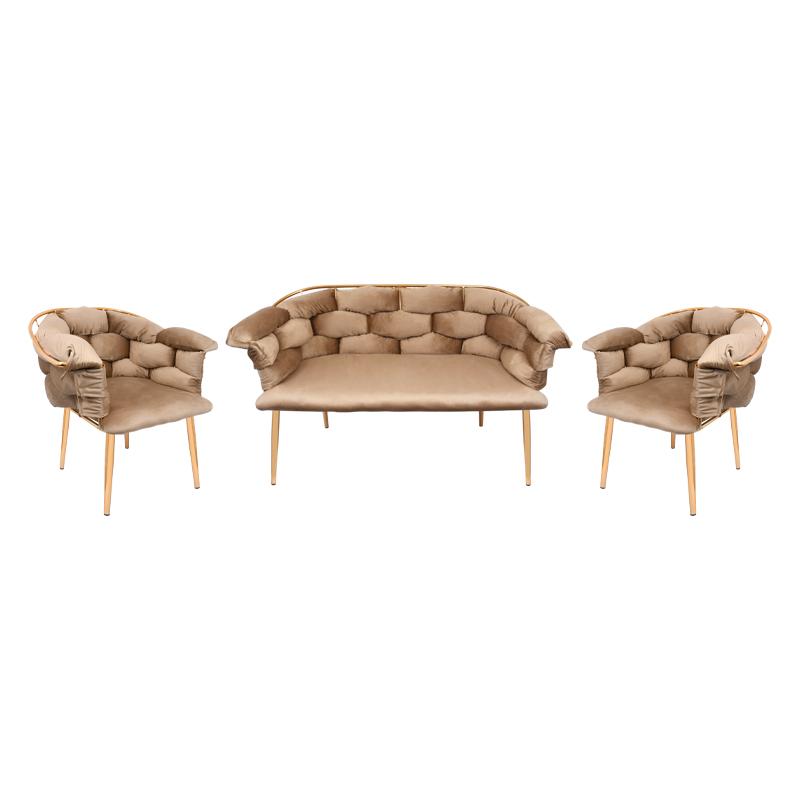 Καναπές δύο Θέσεων: Ο κεντρικός καναπές διαθέτει άνετο κάθισμα και πλάτη, με μαξιλάρια επενδυμένα με το ίδιο μπεζ ύφασμα. Ο χρυσός μεταλλικός σκελετός προσθέτει μια κομψή γραμμή που αναδεικνύει τη συνολική εμφάνιση.