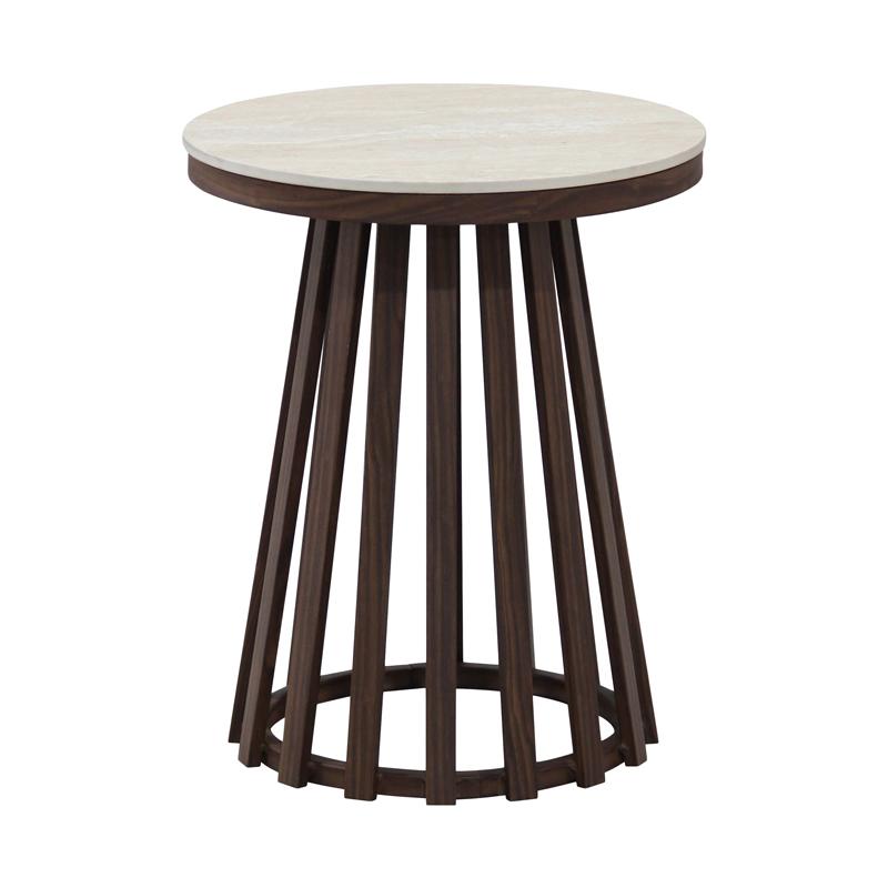 Το τραπέζι στηρίζεται σε μια εντυπωσιακή μεταλλική βάση, τοποθετημένη στο κέντρο, η οποία αποτελείται από πολλές δοκούς σε κυκλική διάταξη. Οι δοκοί είναι τοποθετημένοι με ακτινωτό τρόπο, ξεκινώντας από το κάτω μέρος της βάσης και καταλήγοντας προς την κεραμική επιφάνεια, δημιουργώντας μια αίσθηση σταθερότητας και ισορροπίας.