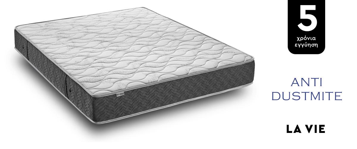 Το στρώμα LA VIE προσφέρει έναν ξεκούραστο, ισορροπημένο ύπνο, με τεχνολογίες που σέβονται το σώμα σου. Το ύφασμα knitted stretch με επεξεργασία Anti Dust Mite καταπολεμά την ανάπτυξη ακάρεων, χάρη σε φυσικά αιθέρια έλαια λεμονιού, λεβάντας και ευκαλύπτου, διατηρώντας το στρώμα υποαλλεργικό και υγιεινό. Οι στρώσεις Fiber Wave, Double Stability Fiber και Dehydrated Resistant Layer 800 συμβάλλουν στη σταθερότητα, τη σωστή κυκλοφορία του αέρα και τη ρύθμιση της υγρασίας.Το σύστημα ελατηρίων Bonnel, σε συνδυασμό με την τεχνολογία Ergo Fit Plus και τη Foam Edge Support, δημιουργεί ένα στρώμα που προσφέρει την ιδανική ισορροπία μεταξύ άνεσης και υποστήριξης. Το κλασικό σύστημα ελατηρίων Bonnel εξασφαλίζει σταθερότητα και αντοχή, ενώ το Ergo Fit Plus προσαρμόζεται στις φυσικές καμπύλες του σώματος, προσφέροντας εξαιρετική εργονομία και ανακούφιση από τις πιέσεις. Παράλληλα, η Foam Edge Support ενισχύει τις άκρες του στρώματος για μέγιστη εκμετάλλευση του, βελτιώνοντας την ανθεκτικότητα και τη σταθερότητα του.