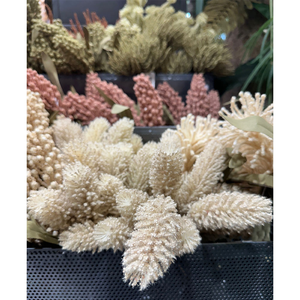 Minimal και κομψό, το τεχνητό λουλούδι AROMA ESSENCE σε απόχρωση του μπεζ προσθέτει φυσική υφή και διακριτική φινέτσα σε κάθε διακόσμηση. Η αφρώδης σύνθεσή του χαρίζει ανάγλυφη αίσθηση, ιδανική για floral συνθέσεις, μποέμ μπουκέτα ή στολισμούς τραπεζιού.