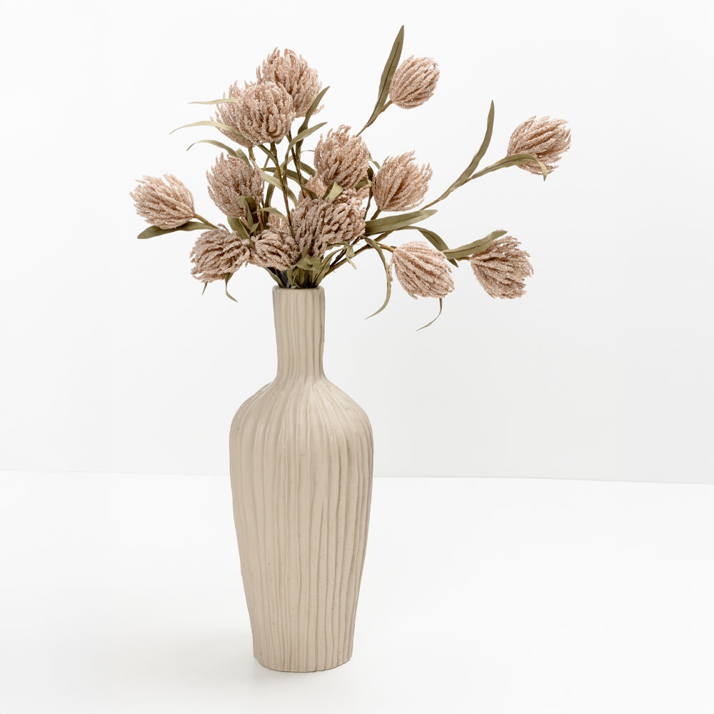 Ένα εντυπωσιακό τεχνητό λουλούδι με ιδιαίτερη υφή, σε φυσικές αποχρώσεις του μπεζ και του πράσινου. Το AROMA ESSENCE 65cm αποπνέει έναν αέρα εκλεπτυσμένης απλότητας, ιδανικό για μεγάλες συνθέσεις, βιτρίνες ή μοντέρνα διακοσμητικά concepts. Οι λεπτομέρειες από foam προσθέτουν μία ανάλαφρη αλλά δυναμική παρουσία.