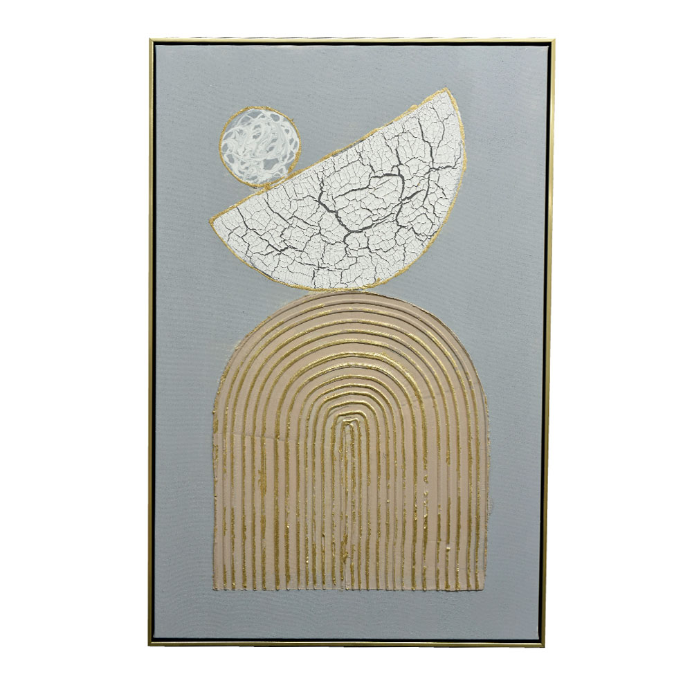 Στον πίνακα Art Vibrance, τα γεωμετρικά σχήματα, φαίνεται να αμφισβητούν την απόλυτη ισορροπία και συμμετρία τους. Οι ρωγμές που διατρέχουν την επιφάνεια των σχημάτων, μοιάζουν να εισέρχονται σε μια διαδικασία αναδόμησης, αφήνοντας μια αίσθηση ανατροπής σε έναν κόσμο αυστηρής γεωμετρίας. Η χρυσή βάση του πίνακα ενισχύει την αντίθεση, προσφέροντας την αίσθηση του σταθερού και του ακλόνητου. Το γκρι φόντο ενισχύει την δυναμική του έργου, ενώ οι μεταλλικές αποχρώσεις του χρυσού και του ασημί προσδίδουν μια αστρική λάμψη στο έργο. Ο πίνακας Art Vibrance θα προσδώσει στο χώρο σας δυναμικότητα και άψογη αισθητική.