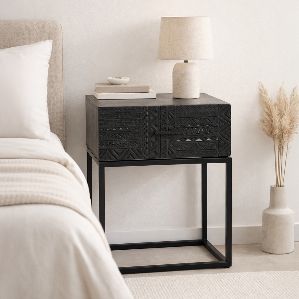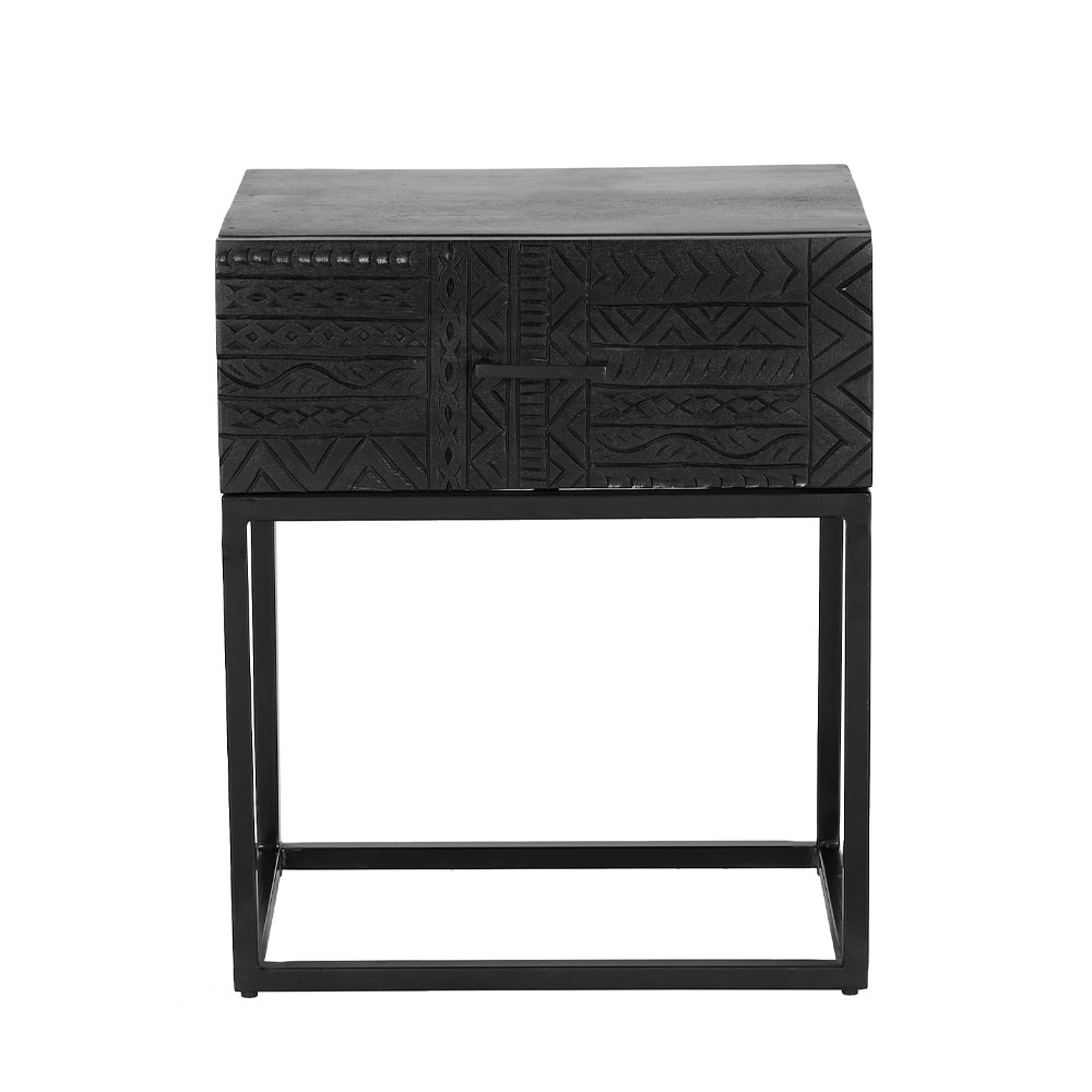Το κομοδίνο Giant αποτελεί την ιδανική επιλογή για μια μοντέρνα και εκλεπτυσμένη αισθητική. Κατασκευασμένο από ξύλο mango σε εντυπωσιακή μαύρη απόχρωση, διαθέτει περίτεχνα σκαλίσματα που αναδεικνύουν τη μοναδικότητά του. Το συρτάρι του προσφέρει πρακτική αποθήκευση, ενώ η σταθερή μαύρη μεταλλική βάση εξασφαλίζει στιβαρότητα και κομψότητα. Ένα έπιπλο που συνδυάζει την καλλιτεχνική λεπτομέρεια με τη λειτουργικότητα, ιδανικό για όσους θέλουν να αναδείξουν τον χώρο τους με στυλ.