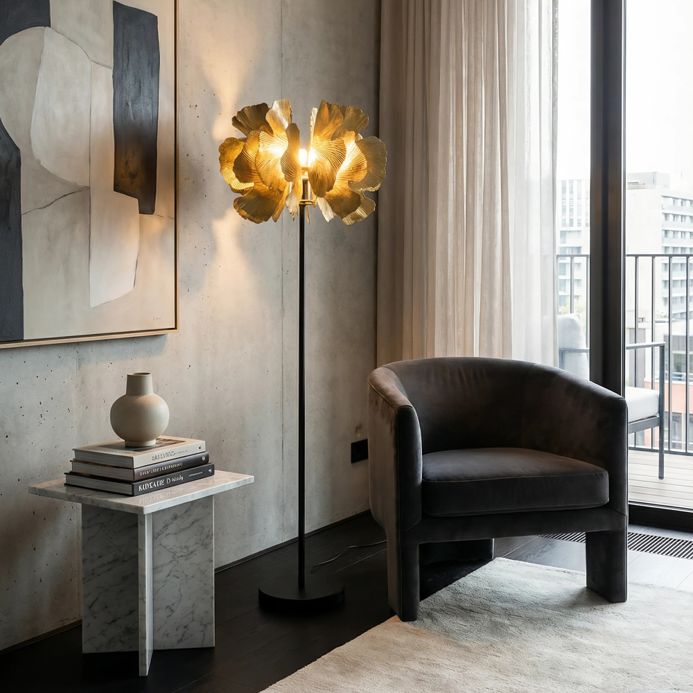 Το επιδαπέδιο φωτιστικό BLOSSOM εντυπωσιάζει με το ύψος του (149 cm) και τον εκλεπτυσμένο σχεδιασμό του. Ο συνδυασμός brown gold καπέλου σε μορφή φύλλων λουλουδιού και μαύρης βάσης δημιουργεί ένα πολυτελές, διαχρονικό αποτέλεσμα. Ιδανικό για γωνιές σαλονιού, υπνοδωμάτια ή επαγγελματικούς χώρους που χρειάζονται ατμόσφαιρα και χαρακτήρα.