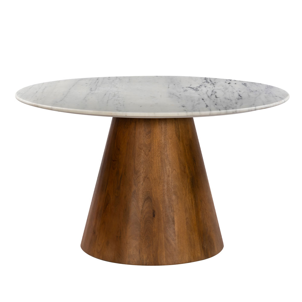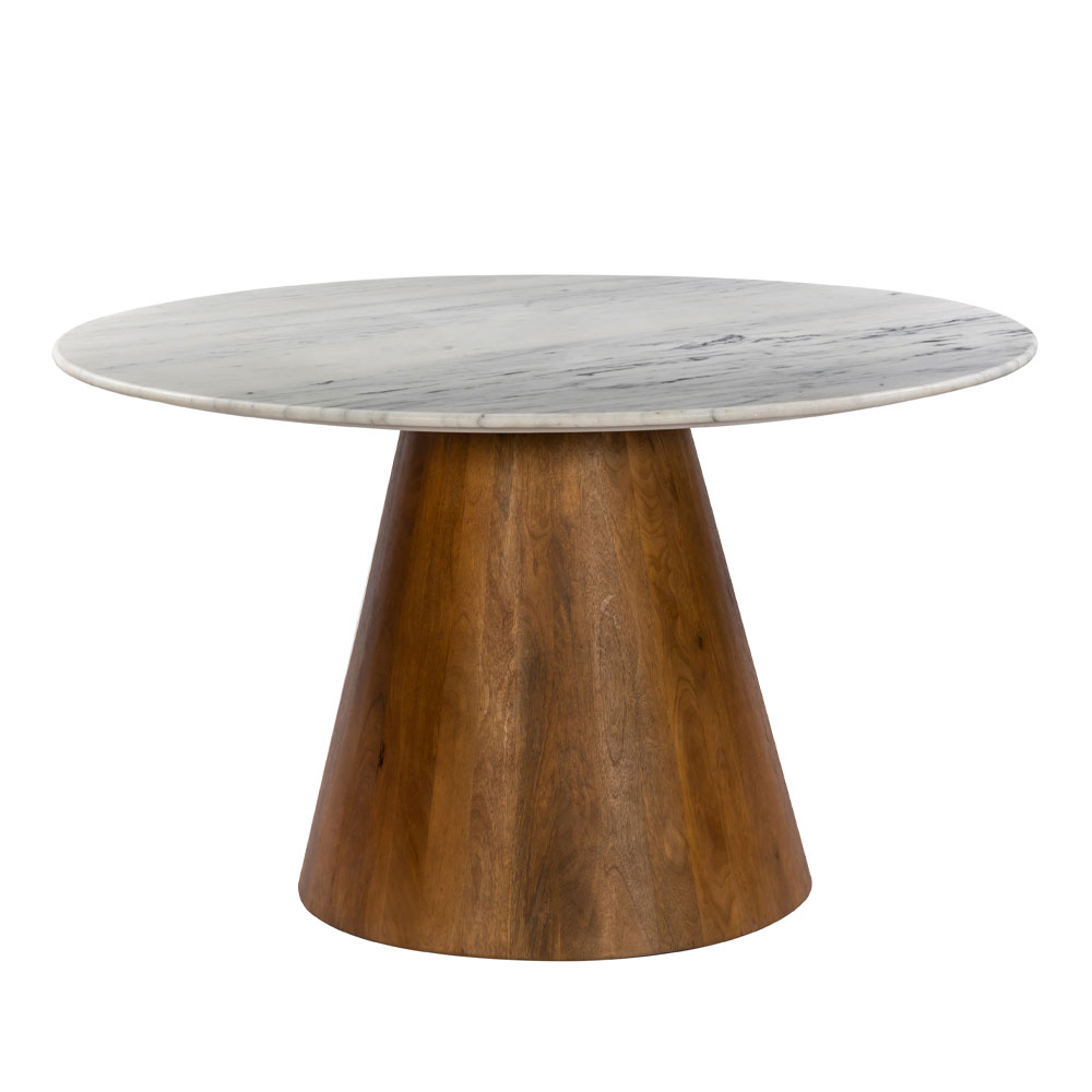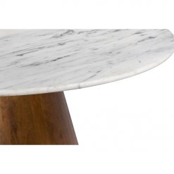 Το τραπέζι CESARE ενώνει τη διαχρονική κομψότητα του μαρμάρου με τη ζεστασιά του ξύλου. Η στρογγυλή του επιφάνεια από λευκό μάρμαρο διαμέτρου 130 cm προσφέρει πολυτελή υφή και φωτεινότητα, ενώ η βάση από ξύλο mango σε απόχρωση καρυδί προσθέτει σταθερότητα και φυσική αρμονία. Ένα τραπέζι φαγητού που ξεχωρίζει για την ισορροπία υλικών και αισθητικής.