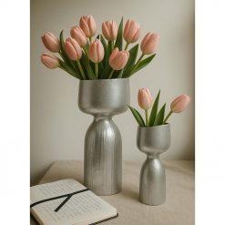 Το βάζο COBI προσφέρει έντονη sculptural παρουσία, ιδανική για high-design περιβάλλοντα. Η ασημί του λάμψη και οι καθαρές γραμμές του δημιουργούν μια εντυπωσιακή μοντέρνα αισθητική. Η κατασκευή από αλουμίνιο εξασφαλίζει εξαιρετική αντοχή και σταθερότητα. Ταιριάζει υπέροχα σε κονσόλες, ράφια ή επαγγελματικούς χώρους όπου η λεπτομέρεια κάνει τη διαφορά.