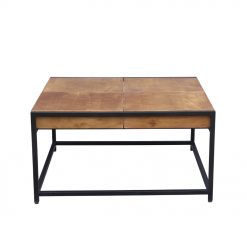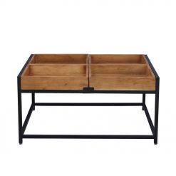 Το τραπεζάκι σαλονιού Combo ενσωματώνει την ιδανική ισορροπία ανάμεσα στη φυσική κομψότητα και τη λειτουργικότητα. Η επιφάνειά του, κατασκευασμένη από καρυδί ξύλο ακακίας, αποτελείται από τέσσερα τετράγωνα τμήματα που κλείνουν, αποκαλύπτοντας κρυφό αποθηκευτικό χώρο. Τα μαύρα μεταλλικά πόδια δημιουργούν μια στιβαρή και σύγχρονη αντίθεση, προσδίδοντας μοντέρνα αισθητική. Ιδανικό για όσους επιθυμούν μια πρακτική λύση που συνδυάζει κομψότητα και οργάνωση στον χώρο του σαλονιού.