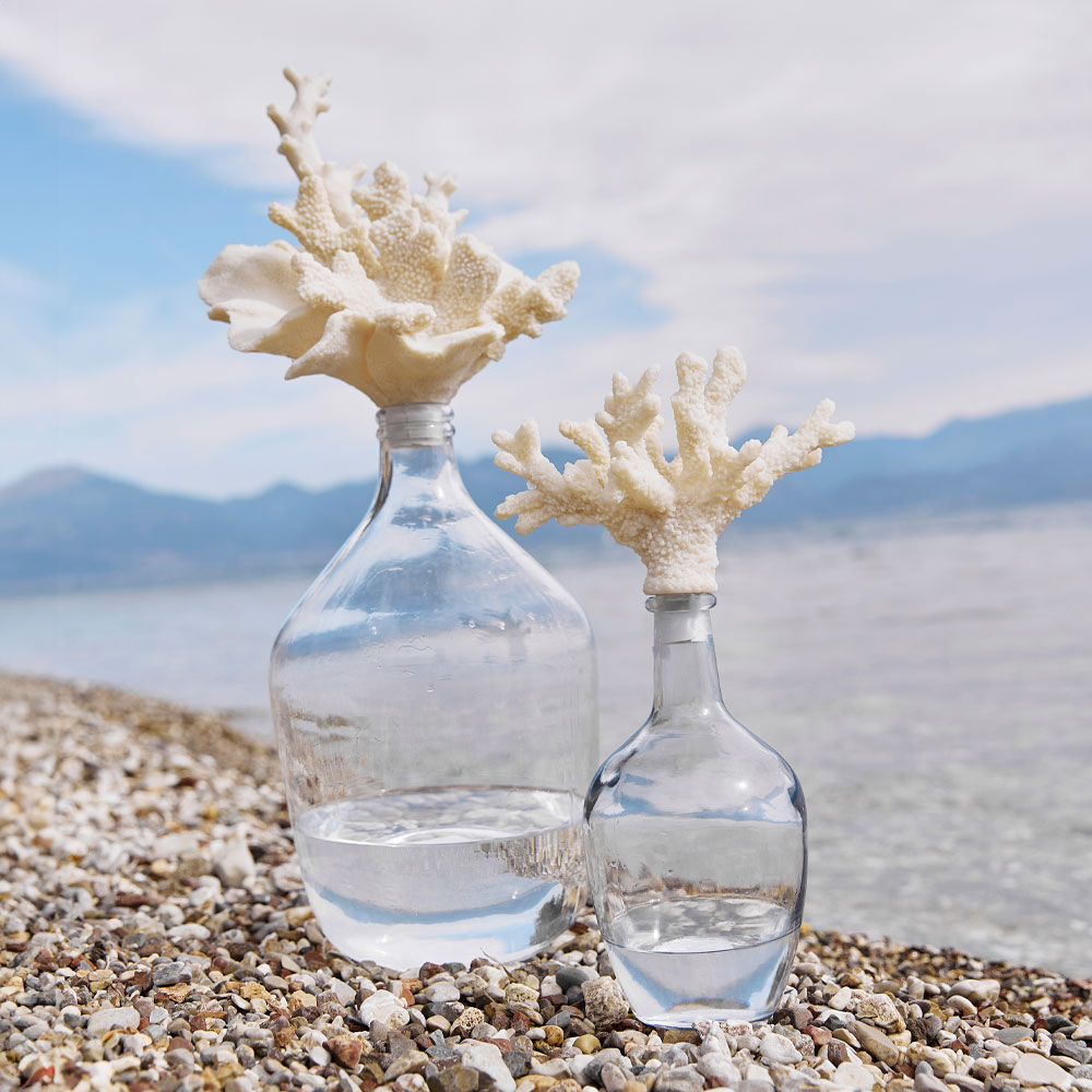 Η διακοσμητική μπουκάλα Coralli είναι ένα ασυνήθιστο και μοντέρνο αντικείμενο, κατασκευασμένο από γυαλί και polyresin. Το πώμα του θυμίζει φυσικό κοράλι, με τις λεπτομέρειες του να προσδίδουν μια αίσθηση φυσικής ομορφιάς και οργανικής μορφής, ενώ το λευκό φωτεινό του χρώμα του το καθιστά ιδανικό για καλοκαιρινή διακόσμηση. Μπορεί να συνδυαστεί με τα αντικείμενα της ίδιας σειράς για πιο εντυπωσιακό αποτέλεσμα.