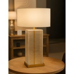 Το ELEVEN είναι ένα κομψό επιτραπέζιο φωτιστικό με διάφανο γυάλινο σώμα και λευκό λινό καπέλο, ιδανικό για χώρους που αναζητούν καθαρή, minimal αισθητική. Ο χρυσός μεταλλικός τόνος προσθέτει μια διακριτική πολυτέλεια που ζεσταίνει τον χώρο. Ταιριάζει άψογα σε σαλόνια, υπνοδωμάτια και μοντέρνα γραφεία. Ένα κομμάτι που αναβαθμίζει εύκολα κάθε διακόσμηση χωρίς υπερβολές.