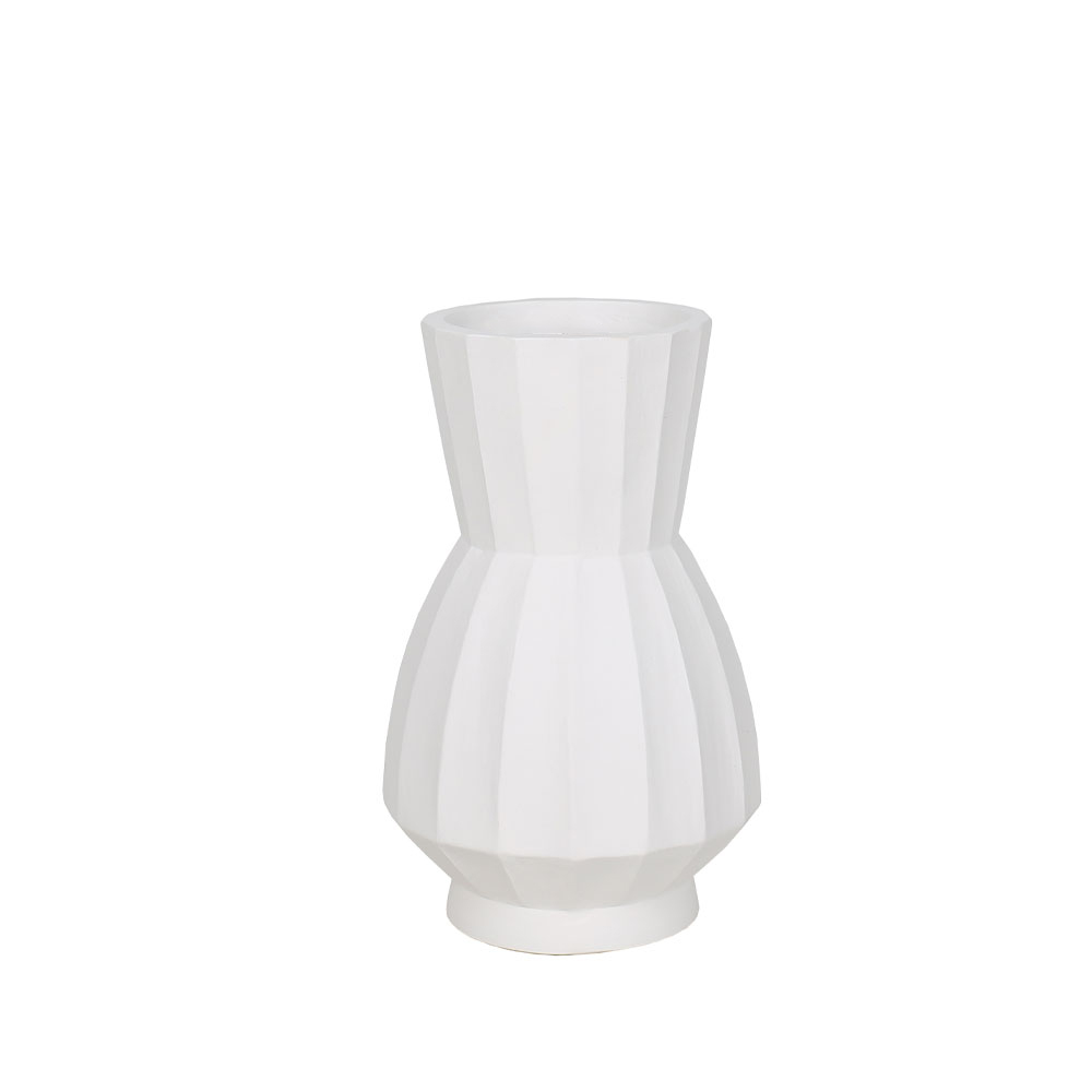 Το βάζο FOLDA ξεχωρίζει για τη γλυπτική του φόρμα και τις απαλές πτυχώσεις που δημιουργούν ένα ήρεμο, σύγχρονο αποτέλεσμα. Η λευκή του απόχρωση φωτίζει τον χώρο και το καθιστά ευέλικτο, ταιριάζοντας εύκολα σε minimal, modern ή φυσικές διακοσμήσεις. Κατασκευασμένο από ανθεκτικό MgO, συνδυάζει αισθητική και πρακτικότητα. Ιδανικό τόσο μόνο του ως διακοσμητικό αντικείμενο όσο και με λουλούδια ή κλαδιά, προσθέτει ύψος και διακριτική κομψότητα σε κάθε επιφάνεια.
