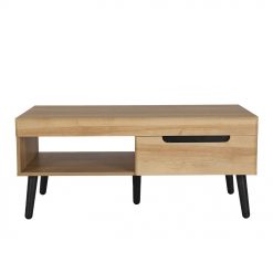 Το τραπεζάκι σαλονιού Grif συνδυάζει τη λειτουργικότητα με την κομψή, μίνιμαλ αισθητική. Κατασκευασμένο από μελαμίνη σε φυσική απόχρωση ξύλου, προσφέρει μια ζεστή και φυσική αίσθηση στον χώρο σας. Το τραπέζι διαθέτει άνετο αποθηκευτικό χώρο με ράφι και δυο συρτάρια, ιδανικό για την οργάνωση αντικειμένων. Οι λεπτομέρειες και τα μαύρα πόδια προσθέτουν μοντέρνο χαρακτήρα, καθιστώντας το τραπεζάκι Grif την ιδανική επιλογή για σύγχρονους χώρους που επιζητούν κομψότητα και πρακτικότητα.