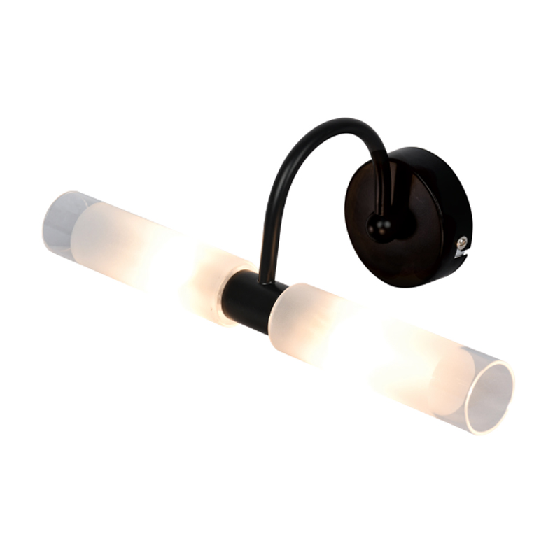 Πρόκειται για ένα επιτοίχιο φωτιστικό κατασκευασμένο από μέταλλο σε μαύρη απόχρωση με δύο λαμπτήρες που καλύπτονται από κυλινδρικό γυαλί αμμοβολής με διάφανες λεπτομέρειες. Είναι η ιδανική επιλογή για φωτισμό μπάνιου τοποθετημένο πάνω από τον καθρέπτη αφού το φως διαχέεται ομοιόμορφα.