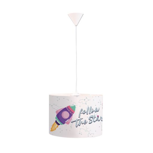 Πρόκειται για ένα κρεμαστό παιδικό φωτιστικό με λευκή ρυθμιζόμενη ανάρτηση και πολύχρωμο καπέλο.