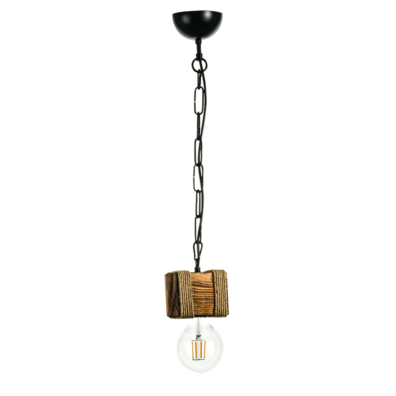 Πρόκειται για μονόφωτο κρεμαστό που συνδυάζει αρμονικά το ξύλο και το σχοινί. Το προϊόν ολοκληρώνει η μαύρη αλυσίδα που του επιτρέπει να προσαρμόζεται ιδανικά στον κάθε χώρο. Μπορεί να τοποθετηθεί είτε ως μονάδα είτε δύο ή τρία μαζί σε ράγα ή ροζέτα για ένα πιο φωτεινό αποτέλεσμα.