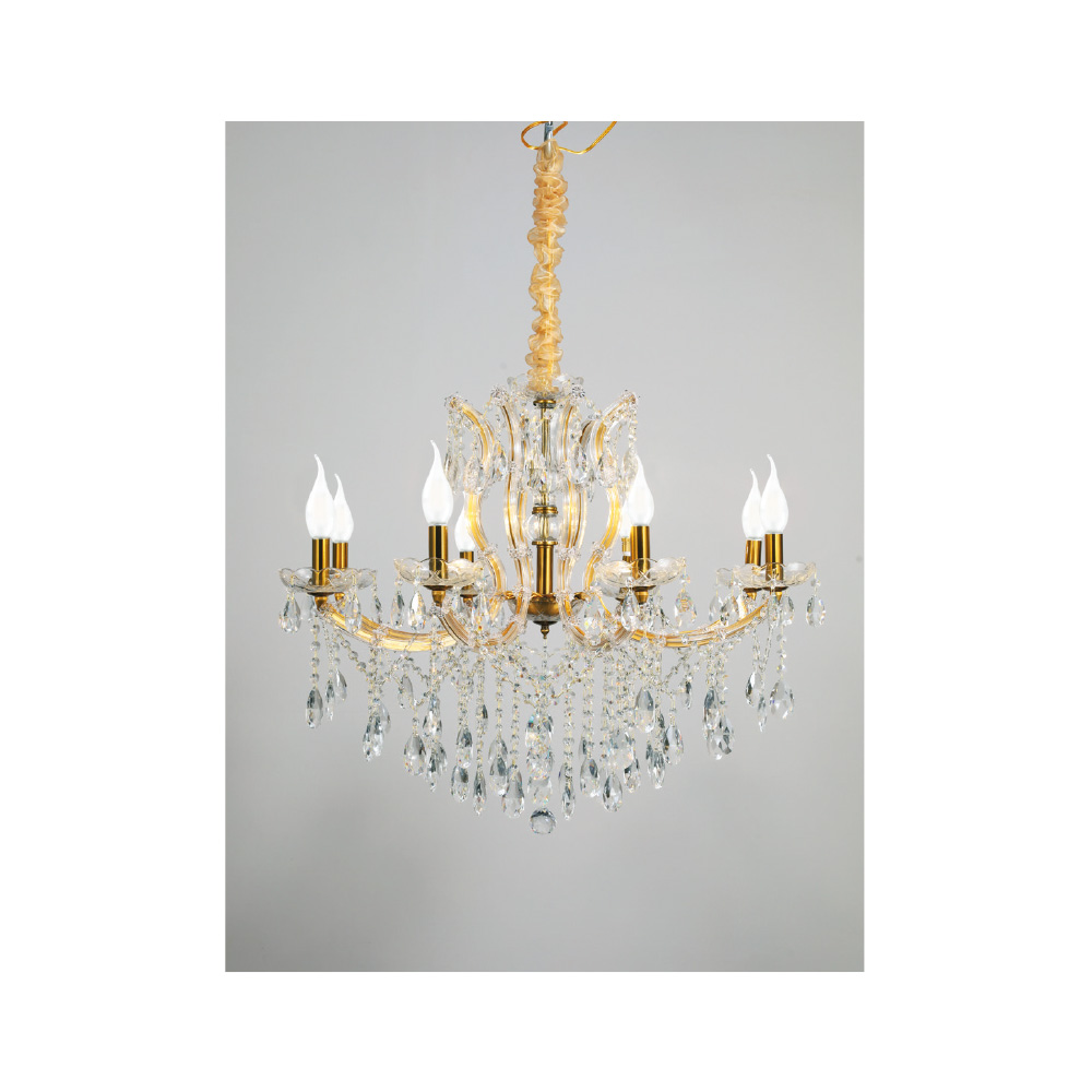 Πρόκειται για ένα κρεμαστό φωτιστικό με οχτώ λαμπτήρες. Το σώμα του αποτελείται από οξυντέ μέταλλο που καλύπτεται από διάφανο γυαλί. Τα κρύσταλλα που το διακοσμούν είναι διάφανα. Η μεταλλική ανάρτηση είναι ρυθμιζόμενη ώστε να προσαρμόζεται στον κάθε χώρο. Διατίθεται και η επιλογή του υφασμάτινου καπέλου το οποίο πρέπει να ζητηθεί επιπλέον.