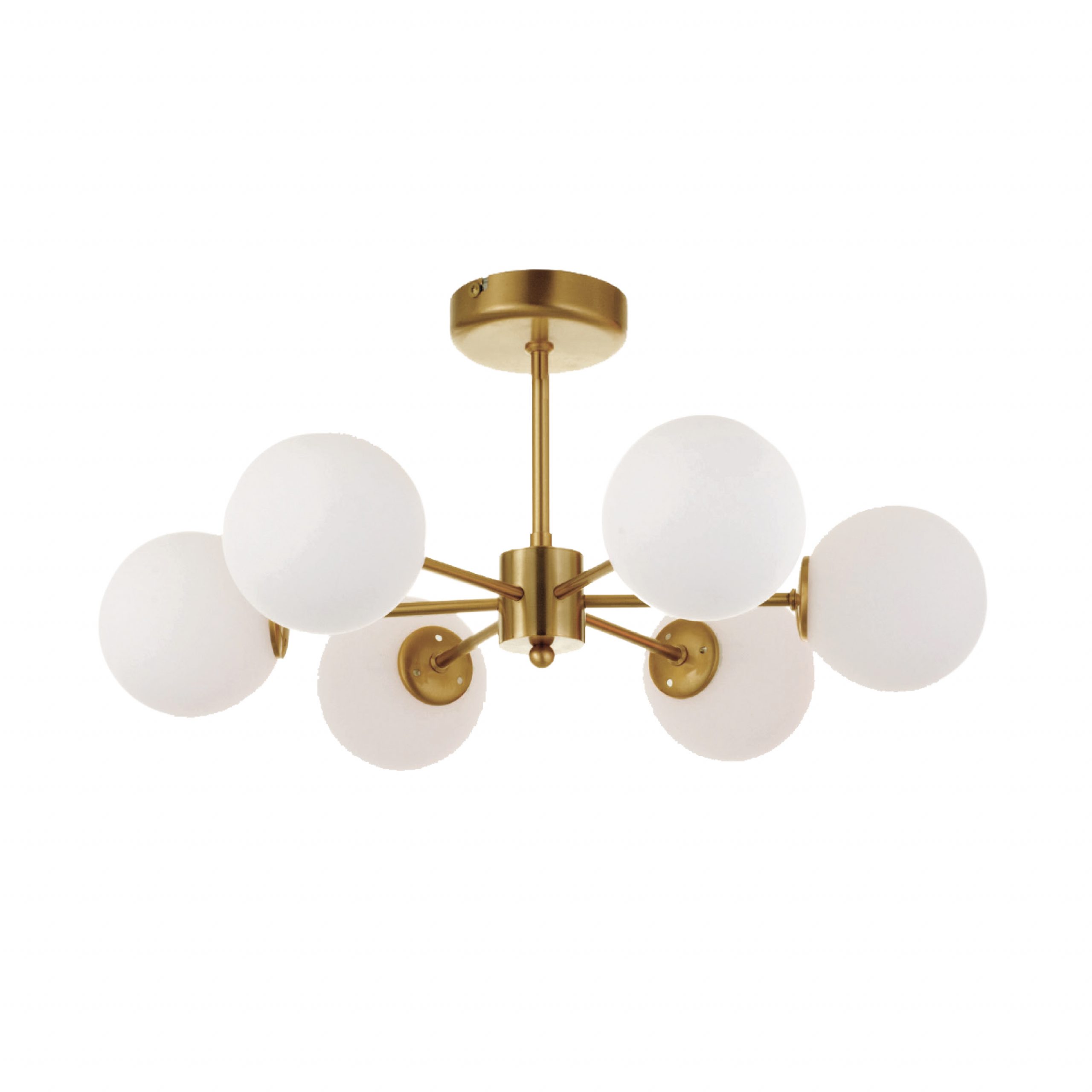 Πρόκειται για ένα χρυσό ματ μεταλλικό φωτιστικό με λευκή οπαλίνα στο τελείωμα και έξι λαμπτήρες. Η μίνιμαλ σχεδίασή του το τοποθετεί ιδανικά σε οποιονδήποτε μοντέρνο αλλά και πιο κλασσικό εσωτερικό χώρο.