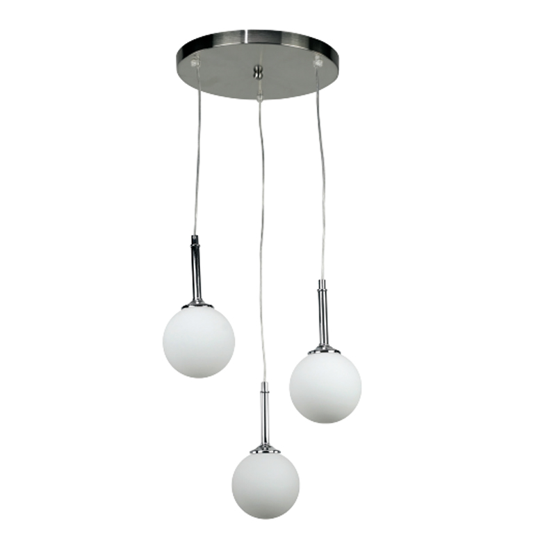 Πρόκειται για ένα χρώμιο μεταλλικό φωτιστικό με λευκή οπαλίνα και τρεις λαμπτήρες. Το ύψος μπορεί να ρυθμιστεί ώστε να προσαρμοστεί στον μοντέρνο χώρο τοποθέτησής του.
