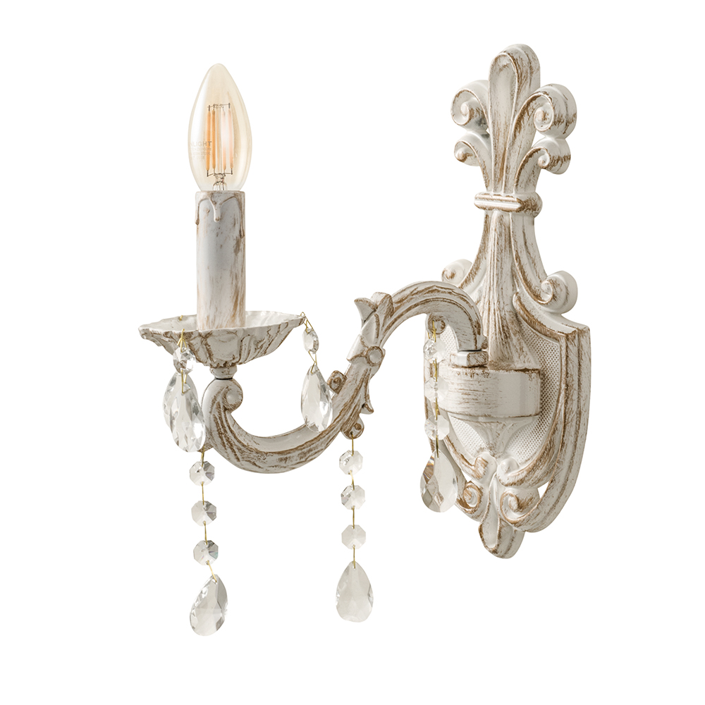 Πρόκειται για ένα μεταλλικό επιτοίχιο φωτιστικό σε απόχρωση μπεζ πατίνας. Τα κρύσταλλα δίνουν μια επιπλέον λάμψη, αλλά μπορούν και να αφαιρεθούν. Διατίθεται και λευκό υφασμάτινο καπέλα για πιο απαλό φωτισμό το οποίο θα πρέπει να ζητηθεί επιπλέον.