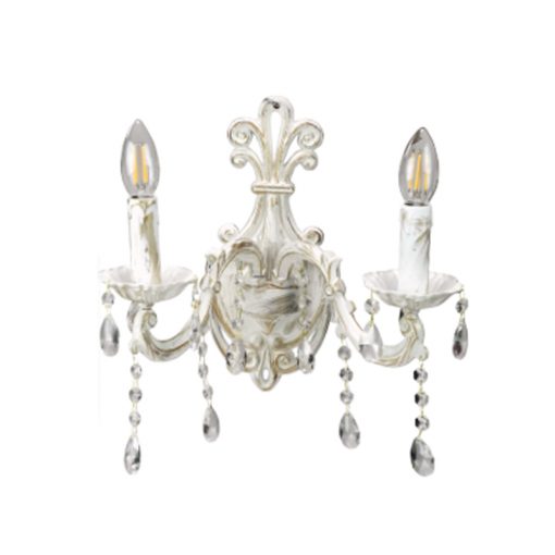 Πρόκειται για ένα μεταλλικό επιτοίχιο φωτιστικό σε απόχρωση μπεζ πατίνας. Τα κρύσταλλα δίνουν μια επιπλέον λάμψη, αλλά μπορούν και να αφαιρεθούν. Διατίθεται και λευκό υφασμάτινο καπέλα για πιο απαλό φωτισμό το οποίο θα πρέπει να ζητηθεί επιπλέον.
