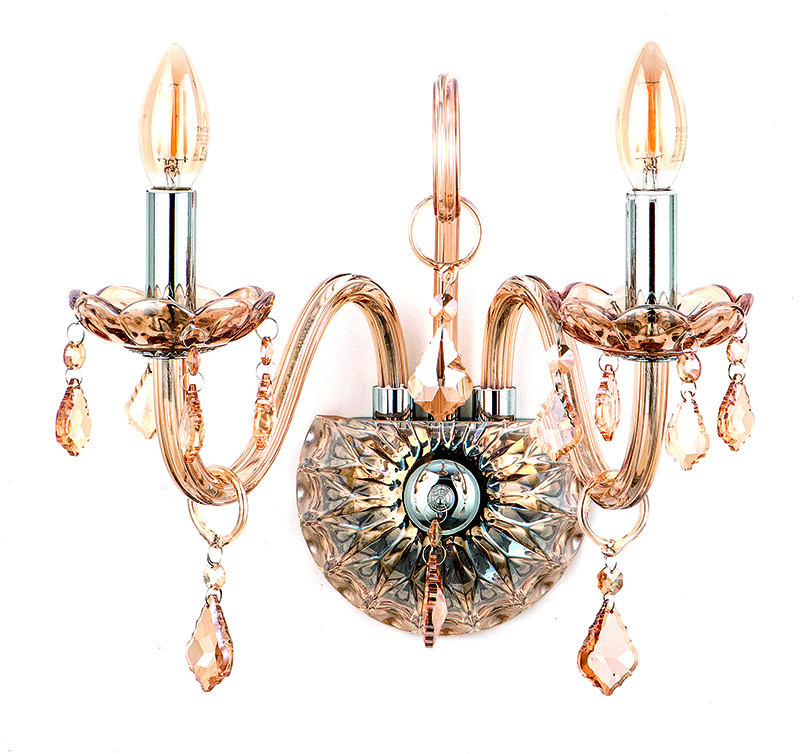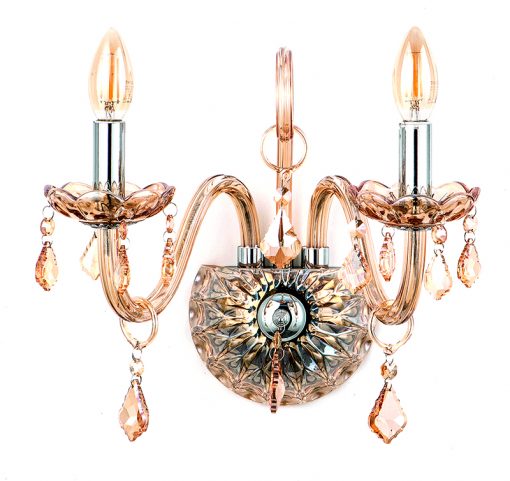 Πρόκειται για ένα μελί γυάλινο επιτοίχιο φωτιστικό με δύο λαμπτήρες. Τόσο τα μελί κρύσταλλα που κρέμονται όσο και οι χρώμιο μεταλλικές λεπτομέρειες του προσδίδουν μια επιπλέον λάμψη.
