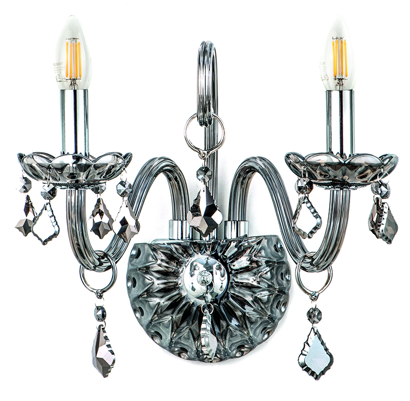 Πρόκειται για ένα φιμέ γυάλινο επιτοίχιο φωτιστικό με δύο λαμπτήρες. Τόσο τα φιμέ κρύσταλλα που κρέμονται όσο και οι χρώμιο μεταλλικές λεπτομέρειες του προσδίδουν μια επιπλέον λάμψη.