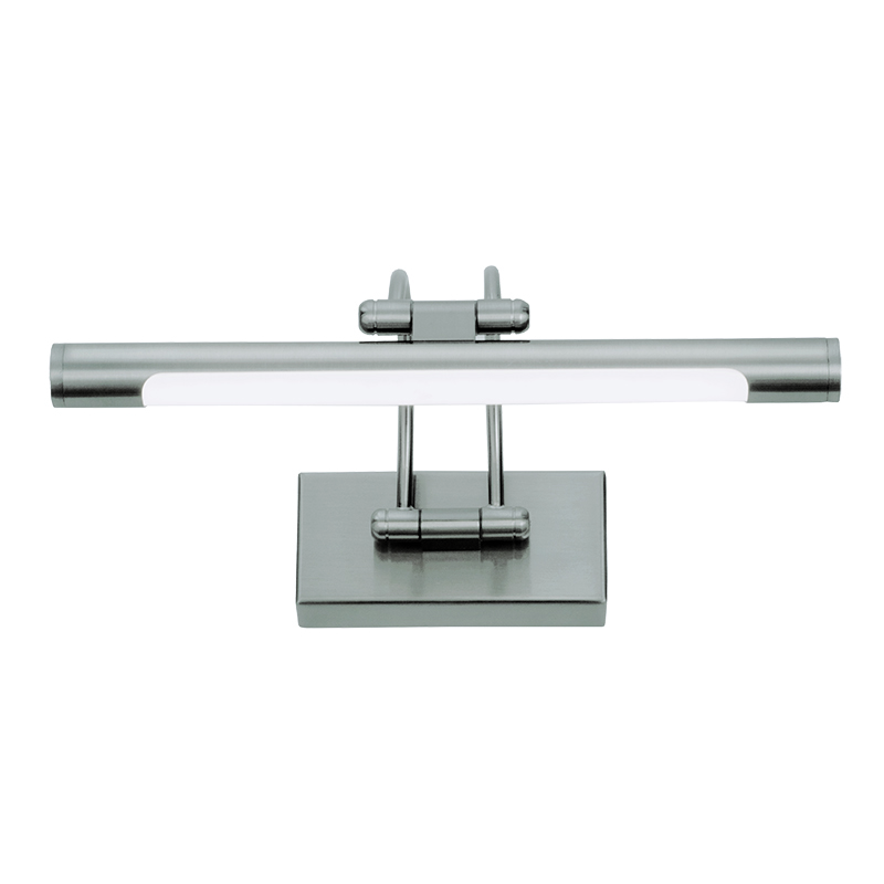 Πρόκειται για ένα νίκελ ματ μεταλλικό επιτοίχιο φωτιστικό με κινούμενο το μπροστινό μέρος. Το λευκό ακρυλικό καλύπτει τον led φωτισμό θερμής απόχρωσης.