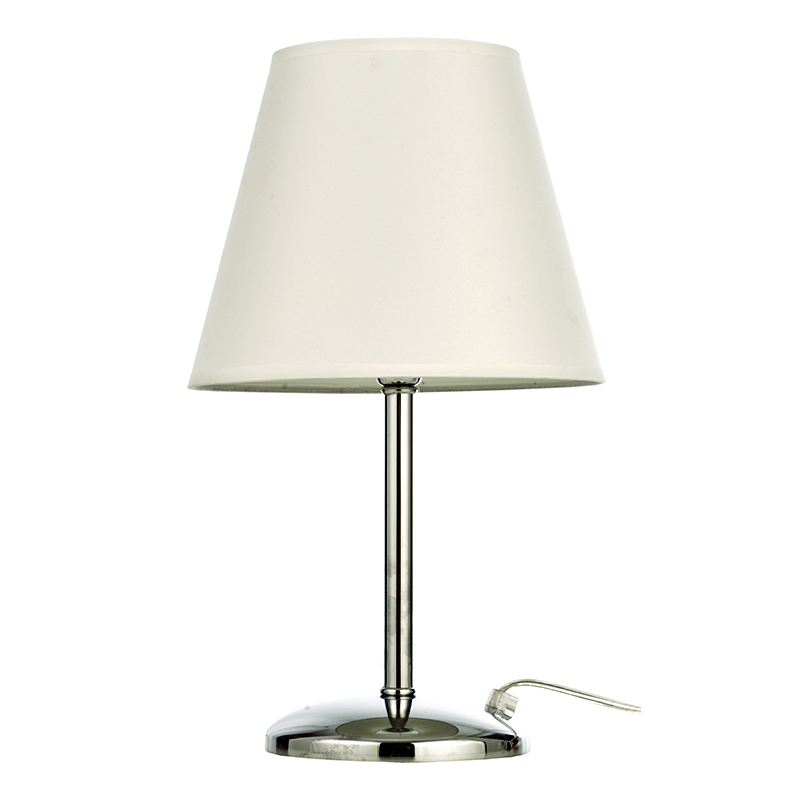 Πρόκειται για ένα μεταλλικό επιτραπέζιο φωτιστικό σε χρώμιο απόχρωση. Το υφασμάτινο καπέλο το συνοδεύει συμπληρώνοντας τη μίνιμαλ σχεδίασή του.