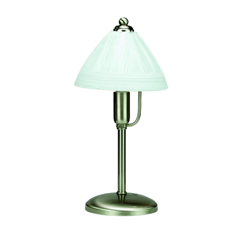 Πρόκειται για ένα νίκελ ματ επιτραπέζιο φωτιστικό. Το λευκό γυαλί συμπληρώνει τη λιτή του σχεδίαση καλύπτοντας ταυτόχρονα τον λαμπτήρα.
