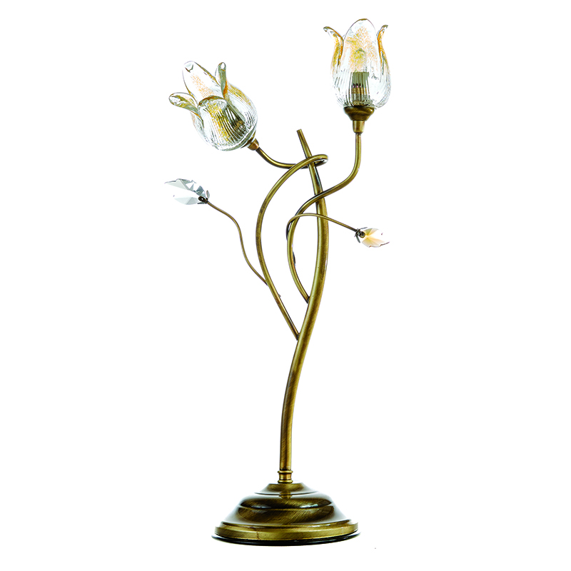 Πρόκειται για ένα οξυντέ μεταλλικό επιτραπέζιο φωτιστικό με δύο λαμπτήρες που καλύπτονται από μελί γυαλιά. Ο συνδυασμός διάφανων και μελί κρυστάλλων το διακοσμούν προσθέτοντας μια επιπλέον λάμψη. Διατίθεται η επιλογή του λευκού γυαλιού καθώς και των διάφανων ή μελί κρυστάλλων μόνο τα οποία θα πρέπει να ζητηθούν.