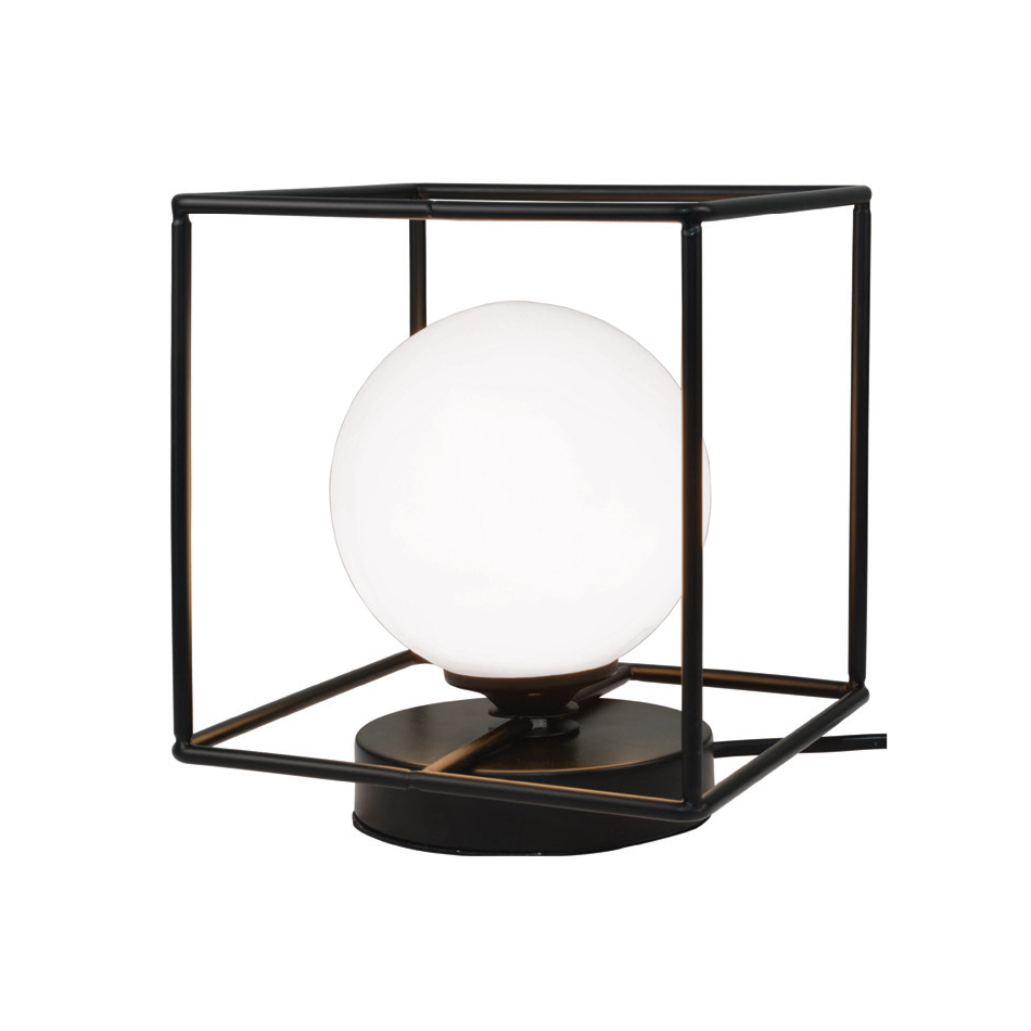 Πρόκειται για ένα γεωμετρικό επιτραπέζιο φωτιστικό κατασκευασμένο από μαύρο μέταλλο και λευκή οπαλίνα. Το φως διαχέεται ομοιόμορφα.