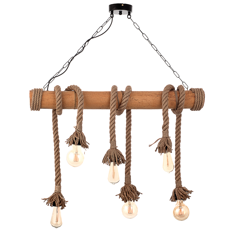 Πρόκειται για ένα φωτιστικό οροφής με έξι λαμπτήρες που συνδυάζει καφέ σχοινί, μπαμπού και μαύρη μεταλλική ανάρτηση. Κατάλληλο για εσωτερικούς χώρους και τοποθετείται ιδανικά πάνω από τραπεζαρία λόγω του σχήματός του. Ο φωτισμός του εξαρτάται από τον λαμπτήρα που θα επιλεχθεί.