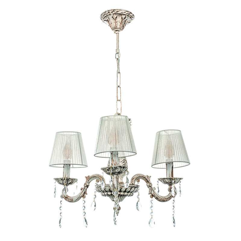 Πρόκειται για ένα μεταλλικό κρεμαστό φωτιστικό σε απόχρωση μπεζ πατίνας με τρεις λαμπτήρες. Τα κρύσταλλα δίνουν μια επιπλέον λάμψη, αλλά μπορούν και να αφαιρεθούν. Η μεταλλική ανάρτηση είναι ρυθμιζόμενη για να προσαρμοστεί στον κάθε χώρο. Διατίθεται και λευκό υφασμάτινο καπέλα για πιο απαλό φωτισμό το οποίο θα πρέπει να ζητηθεί επιπλέον.