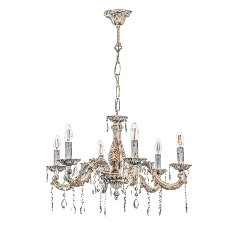 Πρόκειται για ένα μεταλλικό κρεμαστό φωτιστικό σε απόχρωση μπεζ πατίνας με έξι λαμπτήρες. Τα κρύσταλλα δίνουν μια επιπλέον λάμψη, αλλά μπορούν και να αφαιρεθούν. Η μεταλλική ανάρτηση είναι ρυθμιζόμενη για να προσαρμοστεί στον κάθε χώρο. Διατίθεται και λευκό υφασμάτινο καπέλα για πιο απαλό φωτισμό το οποίο θα πρέπει να ζητηθεί επιπλέον.