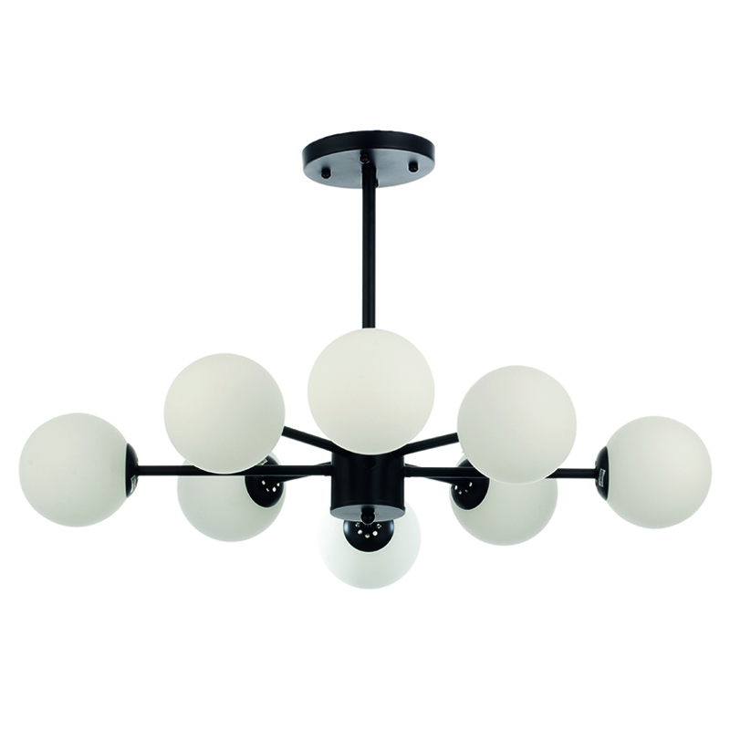 Πρόκειται για ένα μαύρο μεταλλικό φωτιστικό με λευκή οπαλίνα στο τελείωμα και οχτώ λαμπτήρες. Η μίνιμαλ σχεδίασή του το τοποθετεί ιδανικά σε οποιονδήποτε μοντέρνο εσωτερικό χώρο, ακόμα και αν είναι χαμηλοτάβανος.