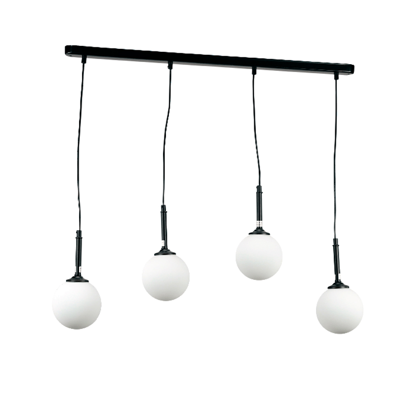 Πρόκειται για ένα μαύρο μεταλλικό φωτιστικό με λευκή οπαλίνα και τέσσερις λαμπτήρες. Το ύψος μπορεί να ρυθμιστεί ώστε να προσαρμοστεί στον μοντέρνο χώρο τοποθέτησής του.