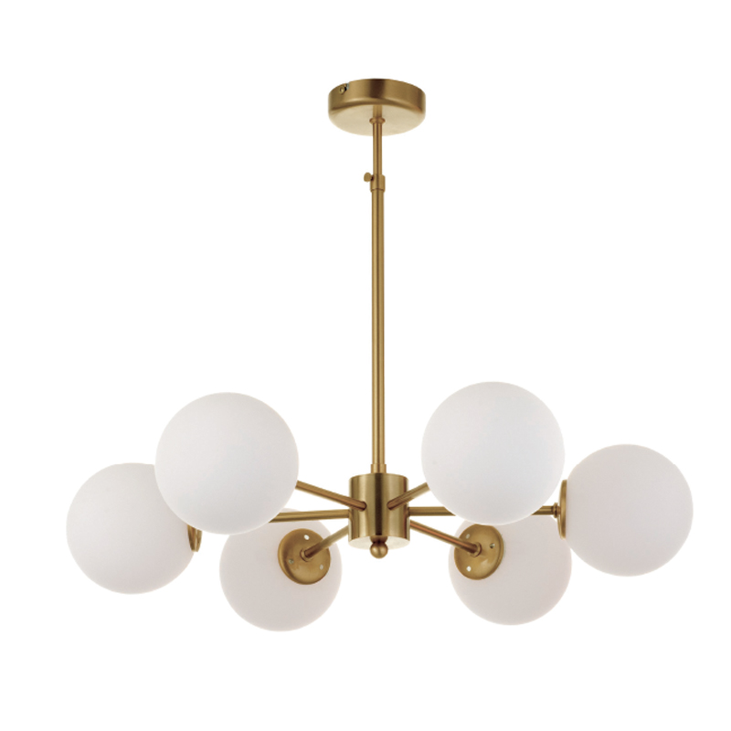 Πρόκειται για ένα χρυσό ματ μεταλλικό φωτιστικό με λευκή οπαλίνα στο τελείωμα και έξι λαμπτήρες. Η μίνιμαλ σχεδίασή του το τοποθετεί ιδανικά σε οποιονδήποτε μοντέρνο αλλά και πιο κλασσικό εσωτερικό χώρο. Η ανάρτησή του είναι μεταλλική και ρυθμιζόμενη ώστε να προσαρμοστεί ιδανικά στον χώρο τοποθέτησής του.