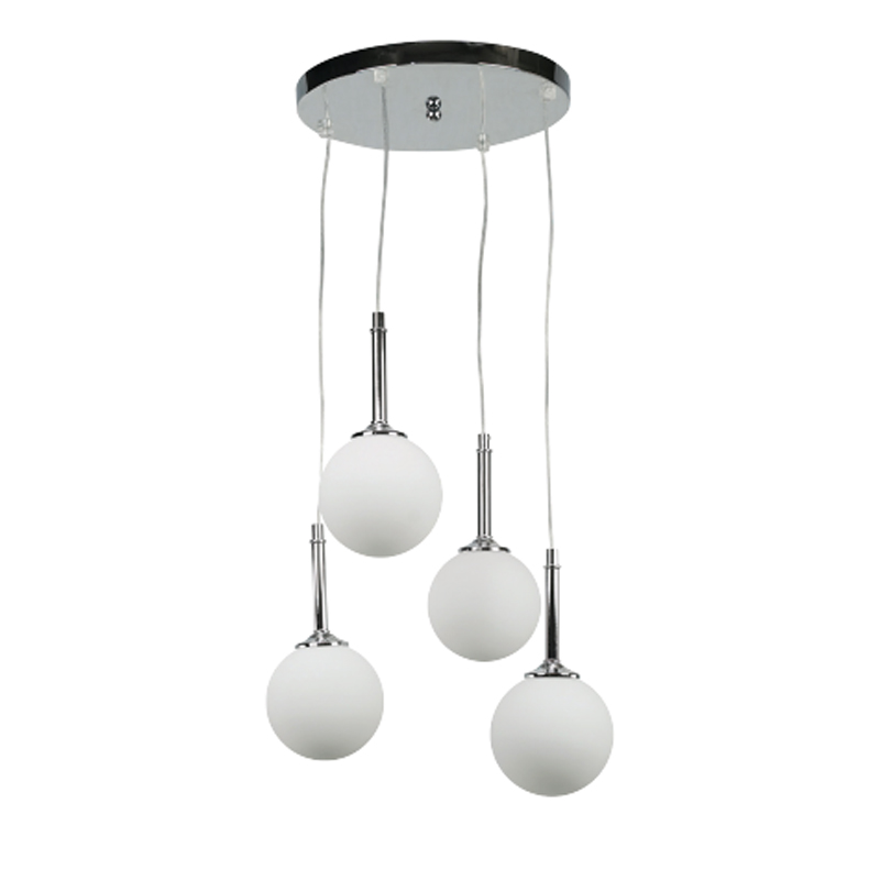 Πρόκειται για ένα χρώμιο μεταλλικό φωτιστικό με λευκή οπαλίνα και τέσσερις λαμπτήρες. Το ύψος μπορεί να ρυθμιστεί ώστε να προσαρμοστεί στον μοντέρνο χώρο τοποθέτησής του.