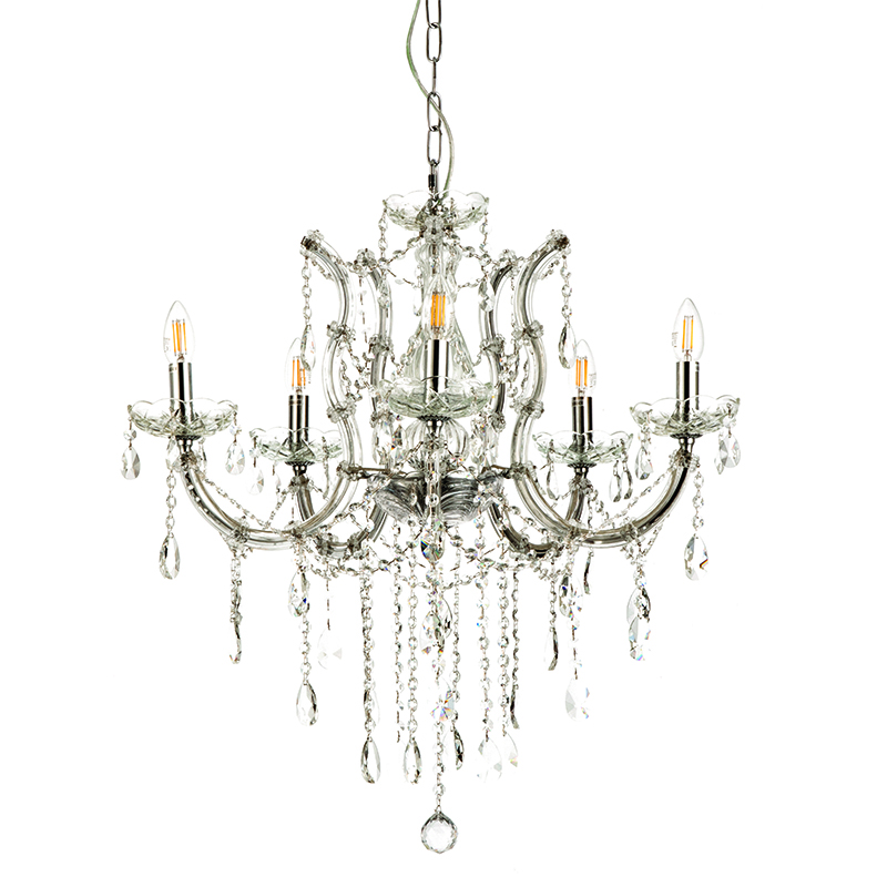 Πρόκειται για ένα κρεμαστό φωτιστικό με έξι λαμπτήρες. Το σώμα του αποτελείται από χρώμιο μέταλλο που καλύπτεται από διάφανο γυαλί. Τα κρύσταλλα που το διακοσμούν είναι διάφανα. Η μεταλλική ανάρτηση είναι ρυθμιζόμενη ώστε να προσαρμόζεται στον κάθε χώρο. Διατίθεται και η επιλογή του υφασμάτινου καπέλου το οποίο πρέπει να ζητηθεί επιπλέον.
