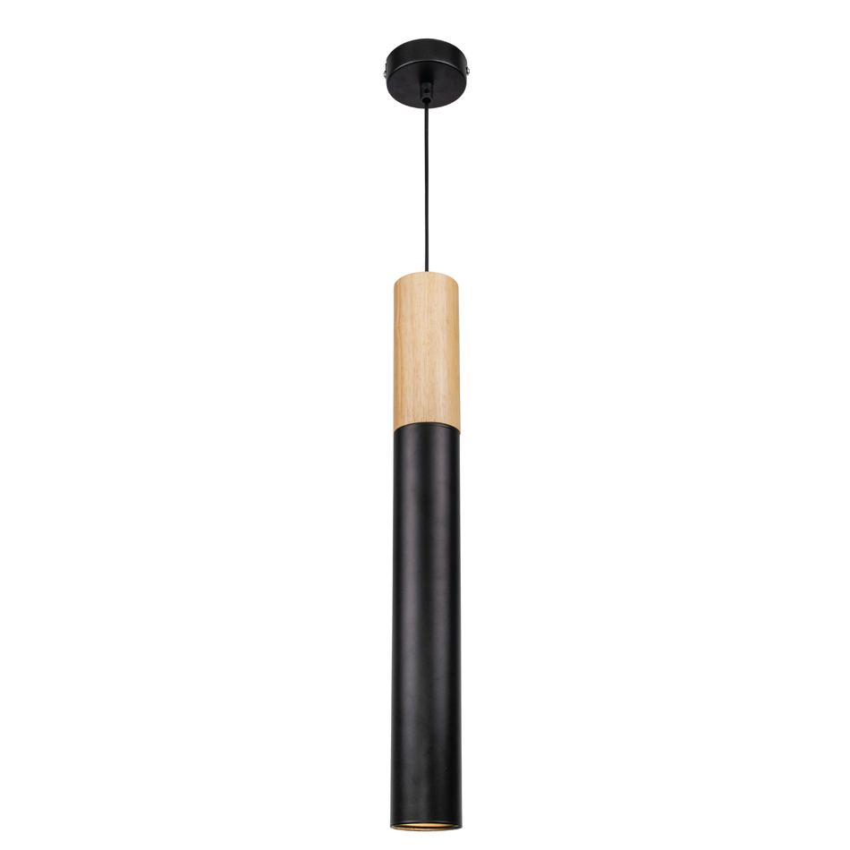 Πρόκειται για ένα κρεμαστό φωτιστικό που συνδυάζει το μαύρο μέταλλο και το ξύλο. Έχει μίνιμαλ αισθητική και το ύψος του είναι ρυθμιζόμενο.