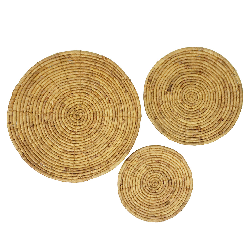 Το διακοσμητικό σετ IOS αποτελείται από τρία χειροποίητα decor τοίχου από φυσικό υάκινθο, σχεδιασμένα ώστε να θυμίζουν παραδοσιακά woven στοιχεία νησιώτικης τέχνης. Οι φυσικοί τόνοι και η οργανική ύφανση προσθέτουν ζεστασιά και αυθεντικότητα, δημιουργώντας ένα boho-chic αποτέλεσμα που μεταμορφώνει κάθε τοίχο σε σημείο αναφοράς.