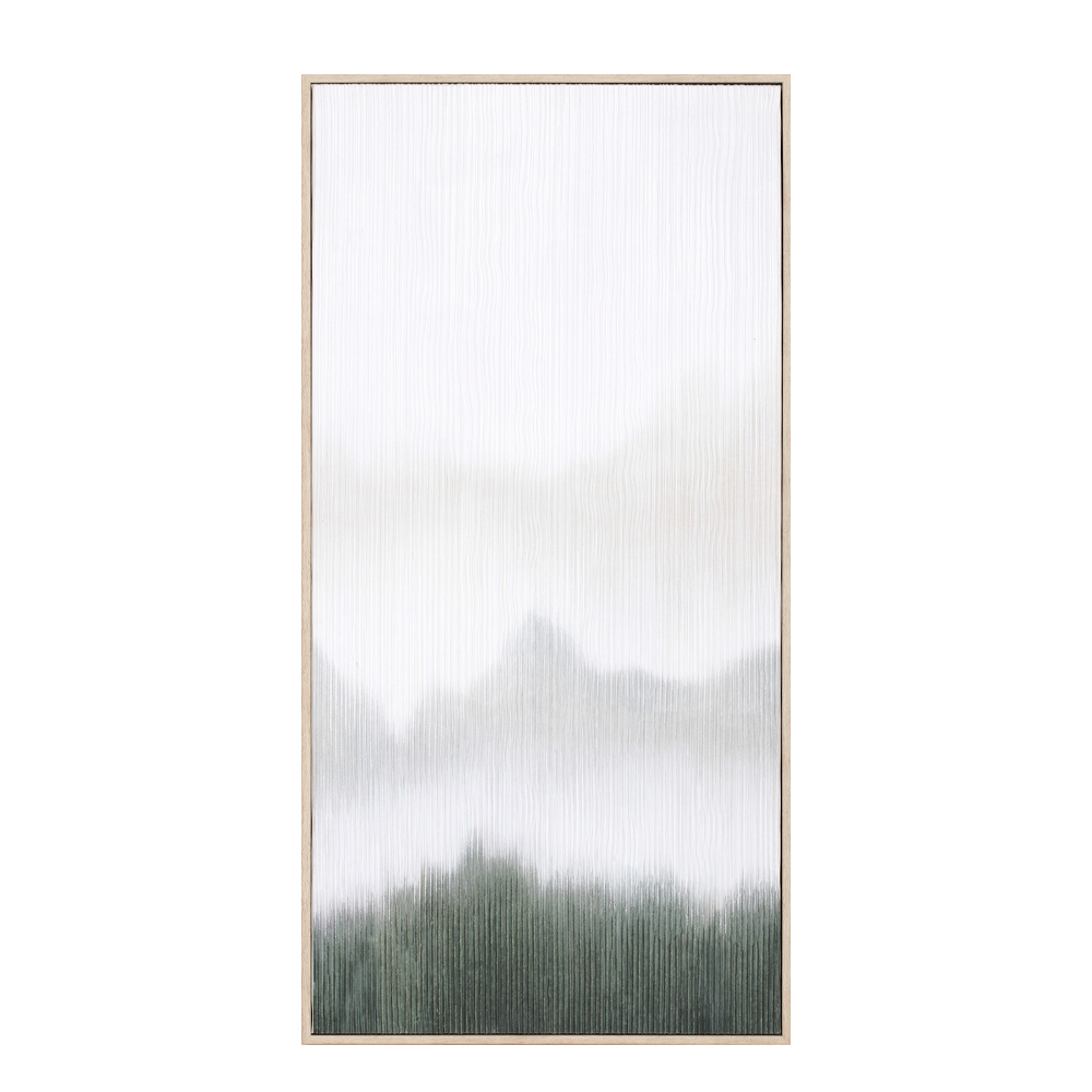 Η τρίτη εκδοχή του Lost in Nature 45x90x5 cm παρουσιάζει μια πιο καθαρή και airy προσέγγιση του τοπίου, με ήπιες αποχρώσεις πράσινου και λευκού που αποπνέουν αίσθηση καθαρότητας και ισορροπίας. Ο πίνακας μεταφέρει την αίσθηση του να χάνεσαι στη φύση και να αναπνέεις ελεύθερα, ενώ η φυσική ξύλινη κορνίζα ολοκληρώνει την εικόνα με λεπτή κομψότητα. Μπορεί να λειτουργήσει ανεξάρτητα ή ως πλευρικό κομμάτι τρίπτυχου.
