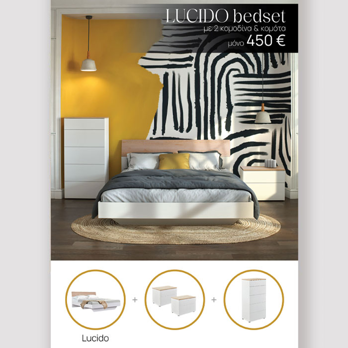 Αναβαθμίστε την αισθητική και τη λειτουργικότητα του υπνοδωματίου σας με το κομψό σετ κρεβατοκάμαρας Lucido 3+1. Το σετ περιλαμβάνει ένα κρεβάτι με μοντέρνο σχεδιασμό, δύο κομοδίνα με δύο ευρύχωρα συρτάρια το καθένα και μία κομότα με πέντε συρτάρια, που προσφέρει άφθονο αποθηκευτικό χώρο. Όλα τα έπιπλα είναι κατασκευασμένα από υψηλής ποιότητας μελαμίνη, συνδυάζοντας τη διαχρονική λευκή oak απόχρωση με τη φυσική ζεστασιά του ξύλου. Το σετ Lucido είναι η ιδανική επιλογή για ένα υπνοδωμάτιο που αποπνέει μοντέρνα κομψότητα και πρακτικότητα.