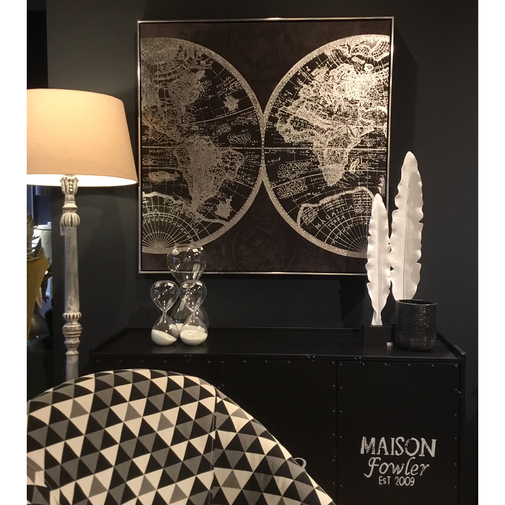 Ο πίνακας διακόσμηση Map συνδυάζει έντονες αντιθέσεις και μοντέρνα αισθητική. Με το μαύρο φόντο να ενισχύεται από ασημί λεπτομέρειες, αποπνέει μία αίσθηση δυναμισμού και κομψότητας, καθιστώντας τον την ιδανική επιλογή για κάθε σύγχρονο χώρο.