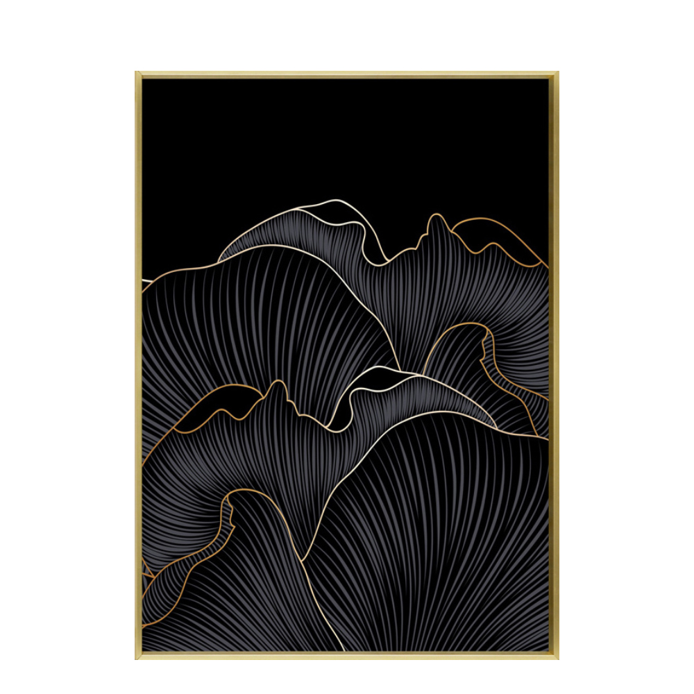 Ο πίνακας METS παρουσιάζει μια καλλιτεχνική μορφή σε αφαιρετικό στυλ, με κυματιστές χρυσές γραμμές πάνω σε βαθύ μαύρο φόντο που δημιουργούν έντονη αντίθεση και premium αισθητική. Η χρυσή λεπτομέρεια δίνει αίσθηση κίνησης και πολυτέλειας, ενώ η κορνίζα ενισχύει τη μοντέρνα ταυτότητα του έργου. Ο καμβάς προσφέρει υφή και βάθος, κάνοντας το σχέδιο να μοιάζει γλυπτικό. Ένας ιδανικός πίνακας για σαλόνια, γραφεία, boutique χώρους και dark–luxury διακόσμηση.