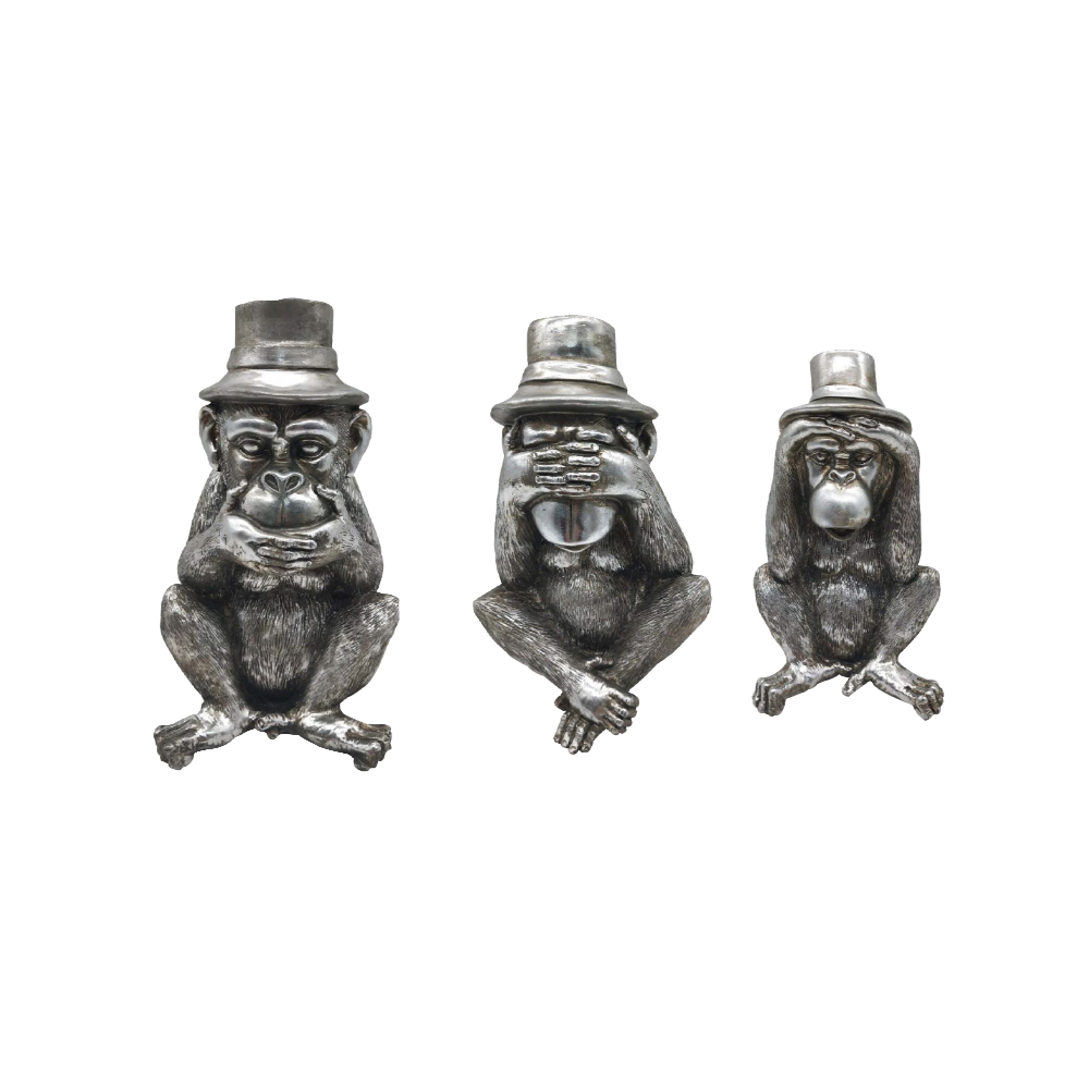 Το MONKIES διακοσμητικό σετ 3 τεμαχίων φέρνει μια παιχνιδιάρικη και ευφάνταστη διάθεση στη διακόσμηση. Οι φιγούρες των μαϊμούδων, με ασημί φινίρισμα και ιδιαίτερες λεπτομέρειες, δημιουργούν ένα ευχάριστο οπτικό αποτέλεσμα που τραβά το βλέμμα. Με διαστάσεις 14x13x22cm, το σετ ταιριάζει ιδανικά σε ράφια, κονσόλες ή γραφεία και μπορεί να τοποθετηθεί είτε ενιαία είτε χωριστά για πιο χαλαρές συνθέσεις. Κατασκευασμένο από polyresin, συνδυάζει αντοχή και χαρακτήρα.